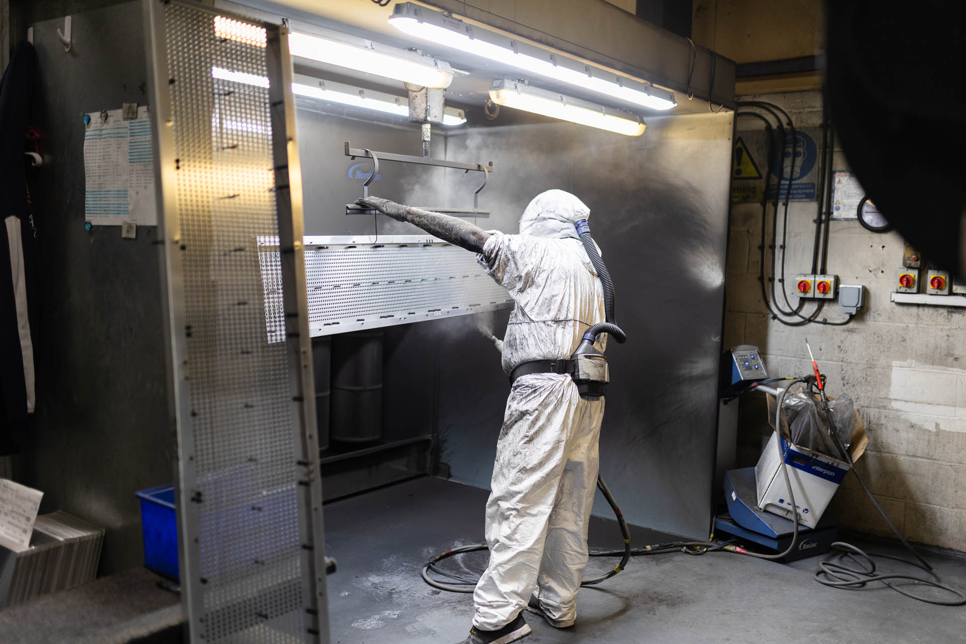 We use the lastest Nordson powder coating guns which agitate the powder to achieve the best possible finishes, we stock a range of powders, with different textures and colours and are beginning to stock a metalic range with finishes similar to chrome and brass.